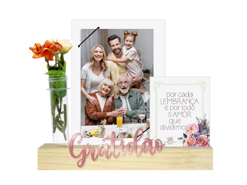 Material base em Pinus com aplique em MDF e tubete em acrilico com espaço para foto 15x10.