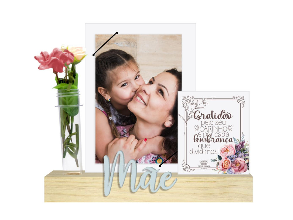 Material base em Pinus com aplique em MDF e tubete em acrilico com espaço para foto 15x10.