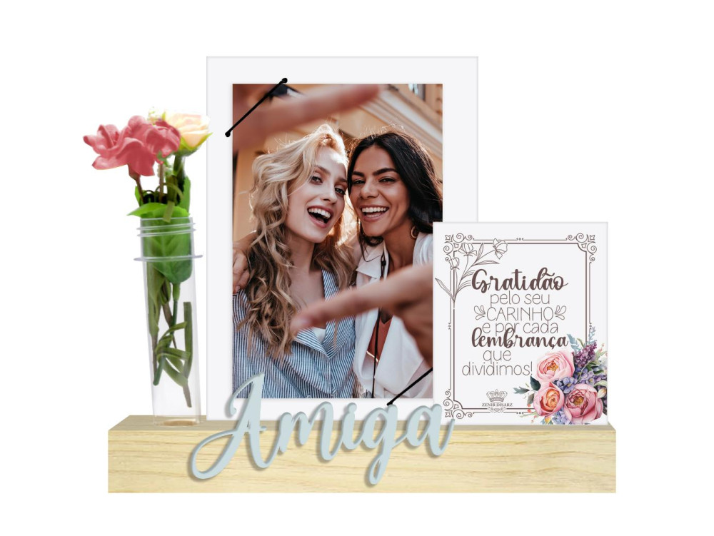 Material base em Pinus com aplique em MDF e tubete em acrilico com espaço para foto 15x10.