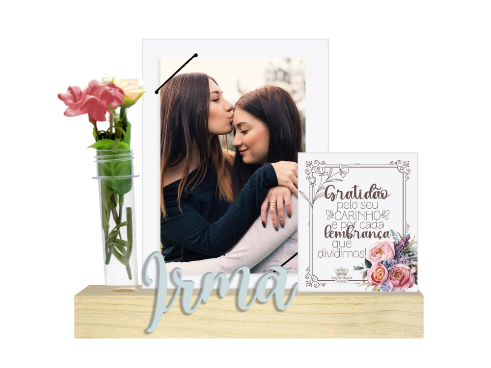 PORTA-RETRATO COM ELÁSTICO, PLACA E TUBETE IRMÃ...BORBOLETA 21X23X4,5