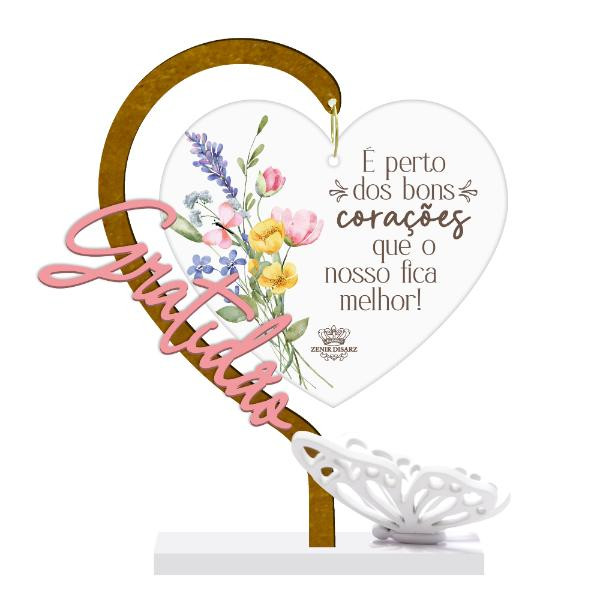 ENFEITE DE MESA COM CORAÇÃO EM ACRILICO GRATIDÃO MUDA TUDO...BORBOLETA 17X13,5