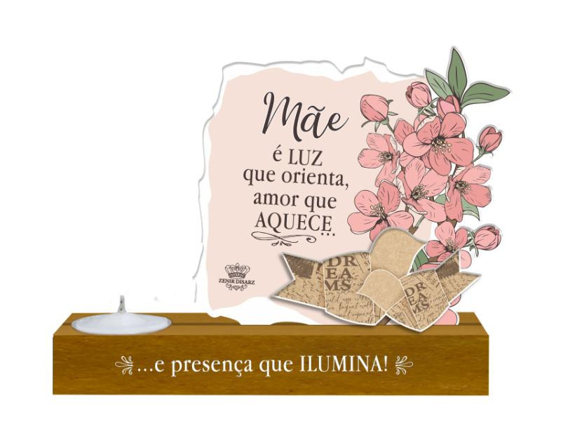 ENFEITE DE MESA COM VELA E APLIQUE MÃE É LUZ...CEREJEIRA 14X18X6
