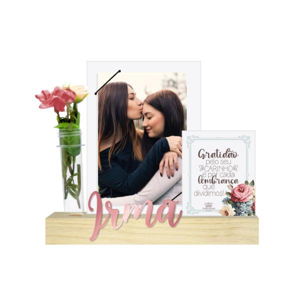 PORTA-RETRATO COM ELÁSTICO, PLACA E TUBETE IRMÃ...ROSÊ 21X23X4,5
