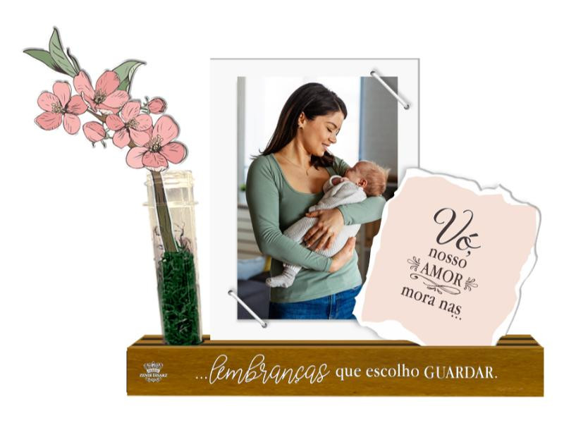 PORTA-RETRATO COM ELÁSTICO, PLACA E TUBETE VÓ NOSSO AMOR...CEREJEIRA 21X23X4,5